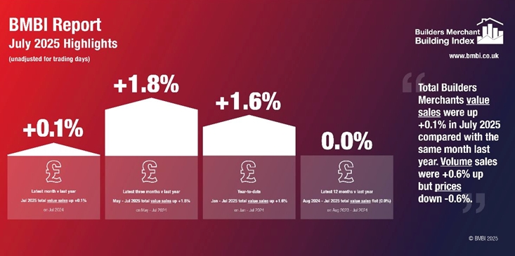 Read Full ArticleThe latest Builders Merchant Building Index report, published in September, shows builders’ merchants’ total value sales in July 2025 were virtually flat (+0.1%) compared to July 2024.