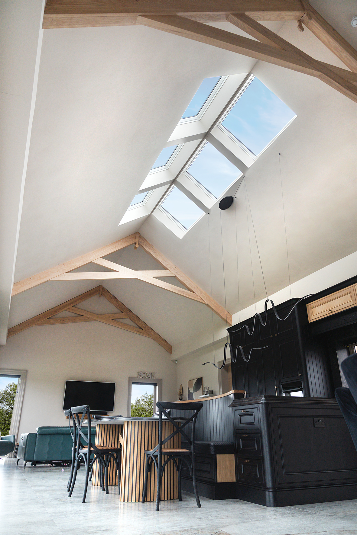 With high ceilings and oak beams, Graham wanted the peak of the house to become a standout feature. He approached local roof window manufacturer Keylite Roof Windows to design a bespoke ridge roof window System (RG) capable of creating a striking beacon of natural light in the main kitchen and living space.